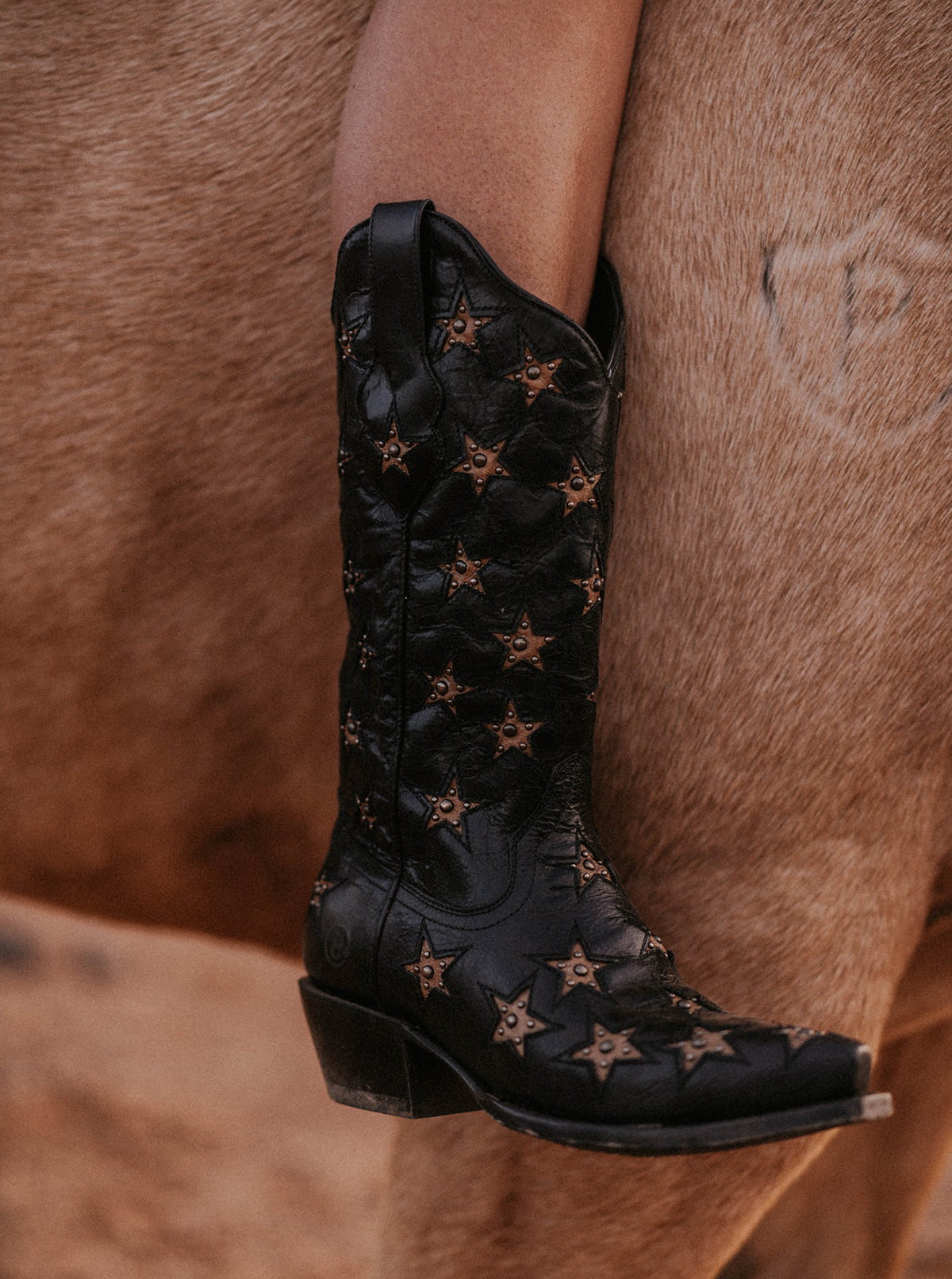 Find comfort in the stars with this Marfa boot. Dressed in a beautiful black full-grain leather and adorned with gold inlay stars and studded embellishments, you are sure to turn heads in this showstopper boot. The Marfa features a 12" shaft height, 2" western heel, and snip toe for a sleek profile design. The Marfa is just as comfortable as it is beautiful thanks to a cushioned footbed and soft leather lining.