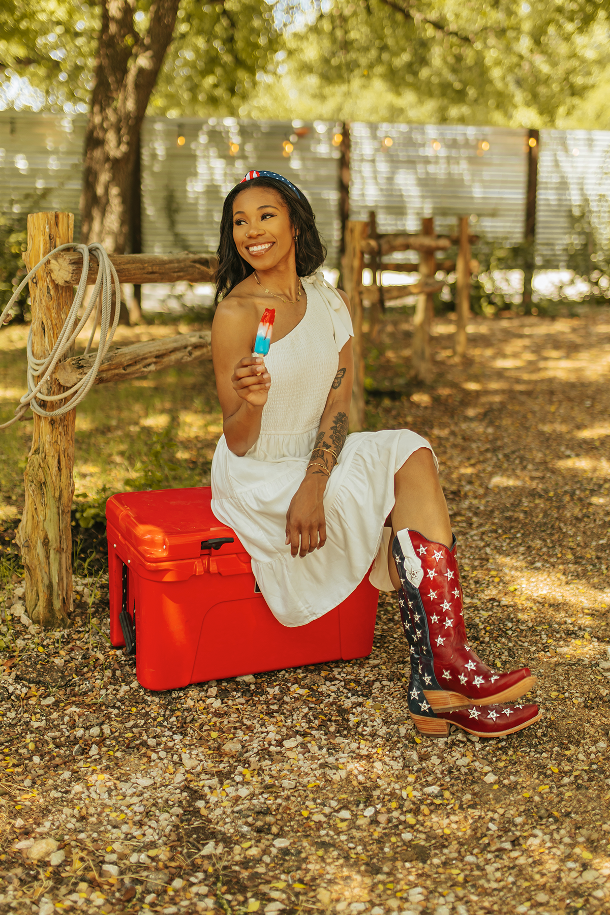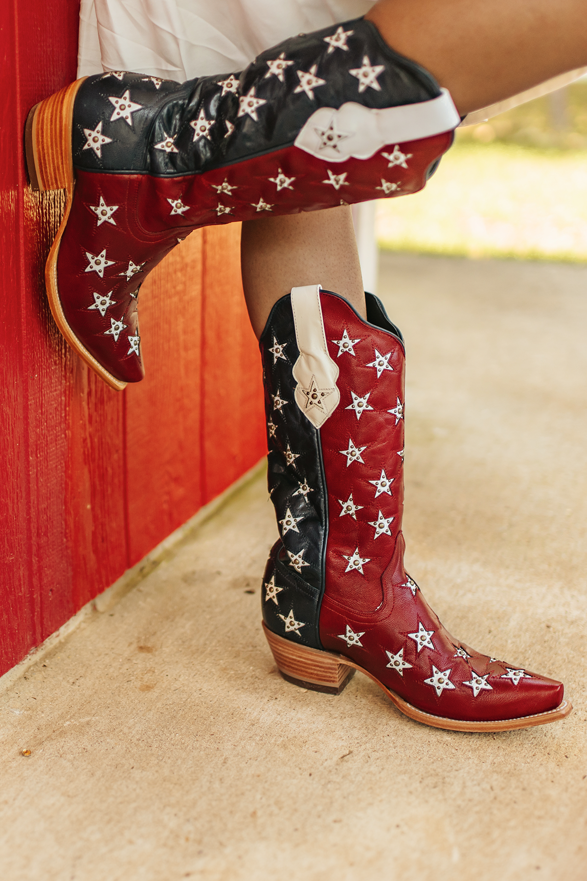 Find comfort in the stars with this Marfa boot. Dressed in beautiful red, white and blue full-grain leathers and adorned with white inlay stars and studded embellishments, you are sure to turn heads in this showstopper boot. The Marfa features a 12" shaft height, 1.75" western heel, and snip toe for a sleek profile design. The Marfa is just as comfortable as it is beautiful thanks to a cushioned footbed and soft leather lining.